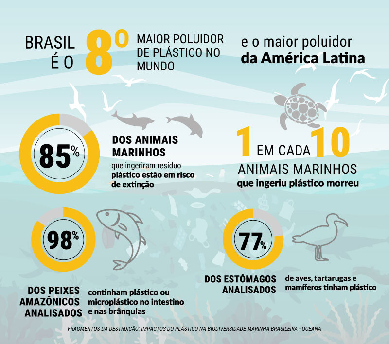 Segundo o relatório Fragmentos da Destruição: impactos do plástico na biodiversidade marinha, publicado pela Oceana em outubro de 2024, a contaminação afetou cerca de 200 espécies no Brasil. O estudo revela que, entre tartarugas, aves e mamíferos que ingerem plástico, um em cada dez não sobrevive.